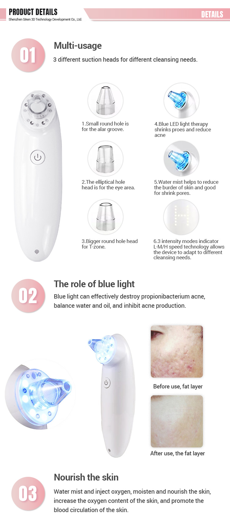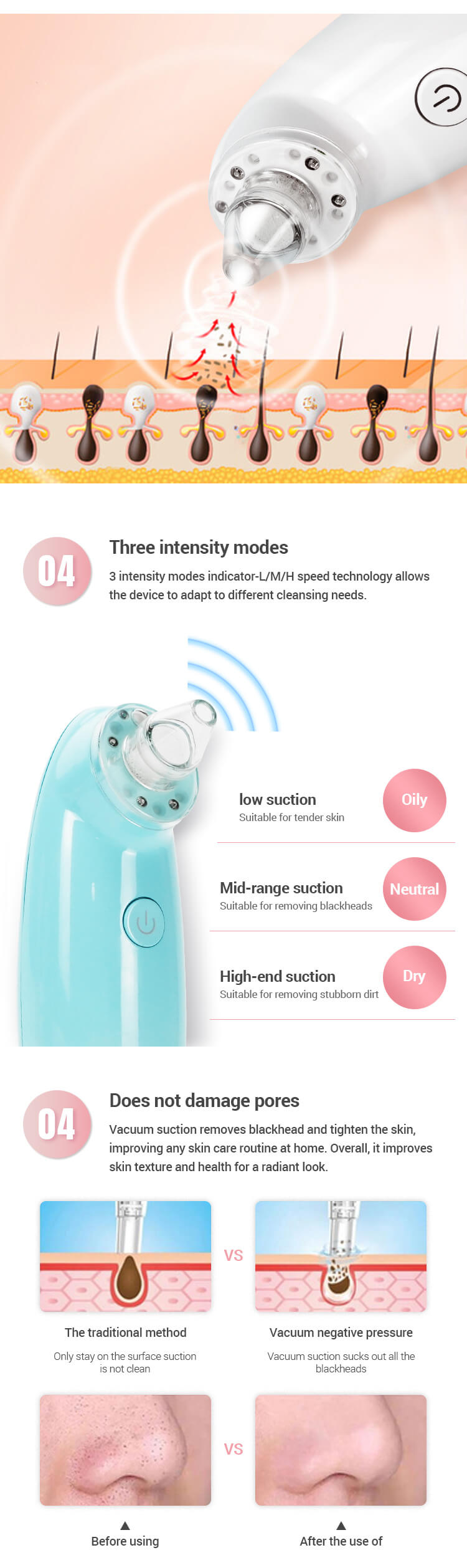 Un aspirateur élimine les boutons, raffermit la peau et améliore les soins quotidiens de la peau à la maison. Dans l'ensemble, il améliore la texture et la santé de la peau pour un look radieux.